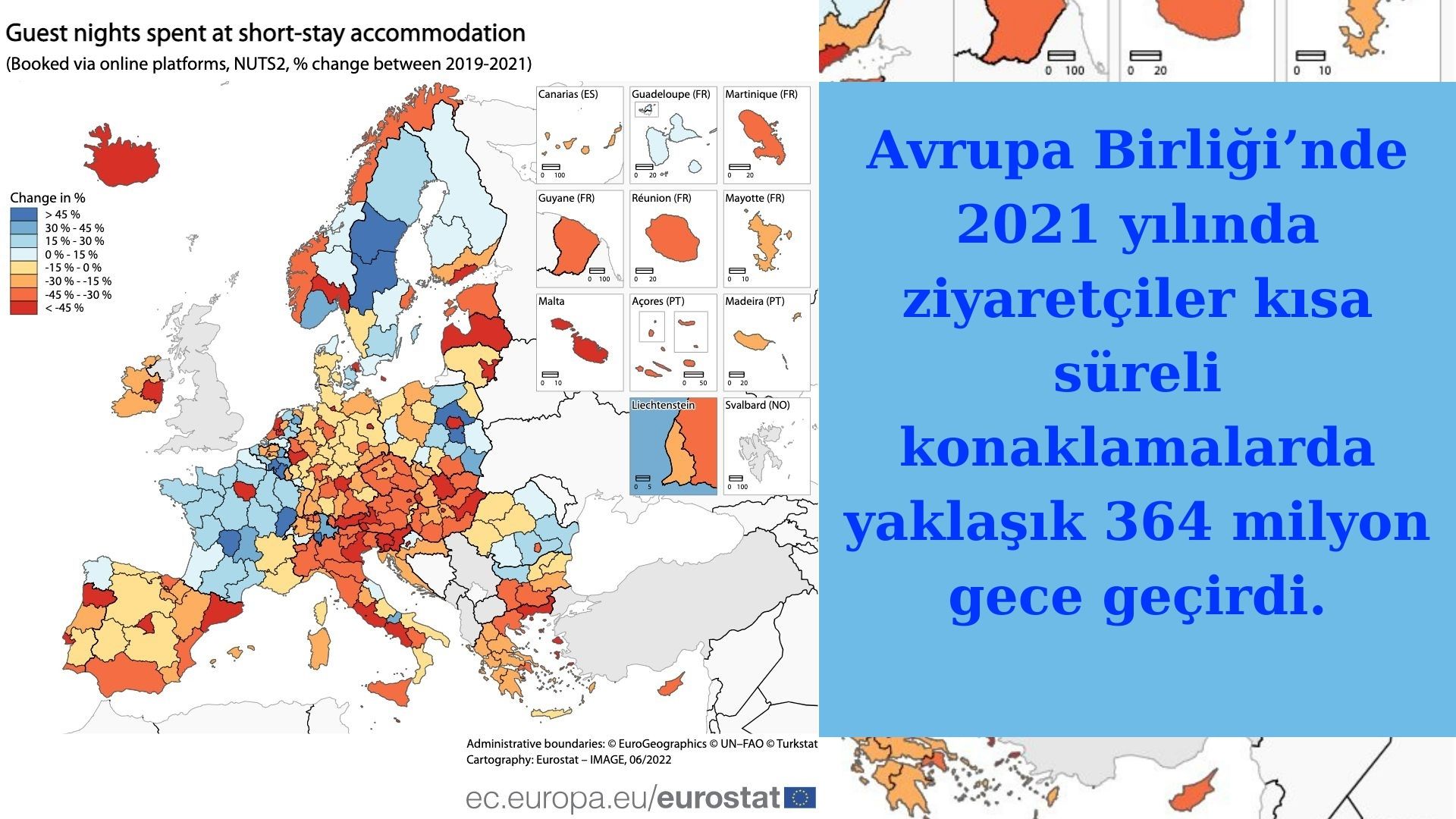 AB’de Airbnb, Booking, Expedia Group veya Tripadvisor aracılığıyla rezerve edilen kısa süreli kiralık konaklamalarda yaklaşık 364 milyon gece geçirildi. Bu, 2020’ye kıyasla yaklaşık yüzde 34 artışa işaret etse de 2019 yılındaki 512 milyon gecelik konaklamanın ise yüzde 29 altında ziyaretçi kaydedildi.