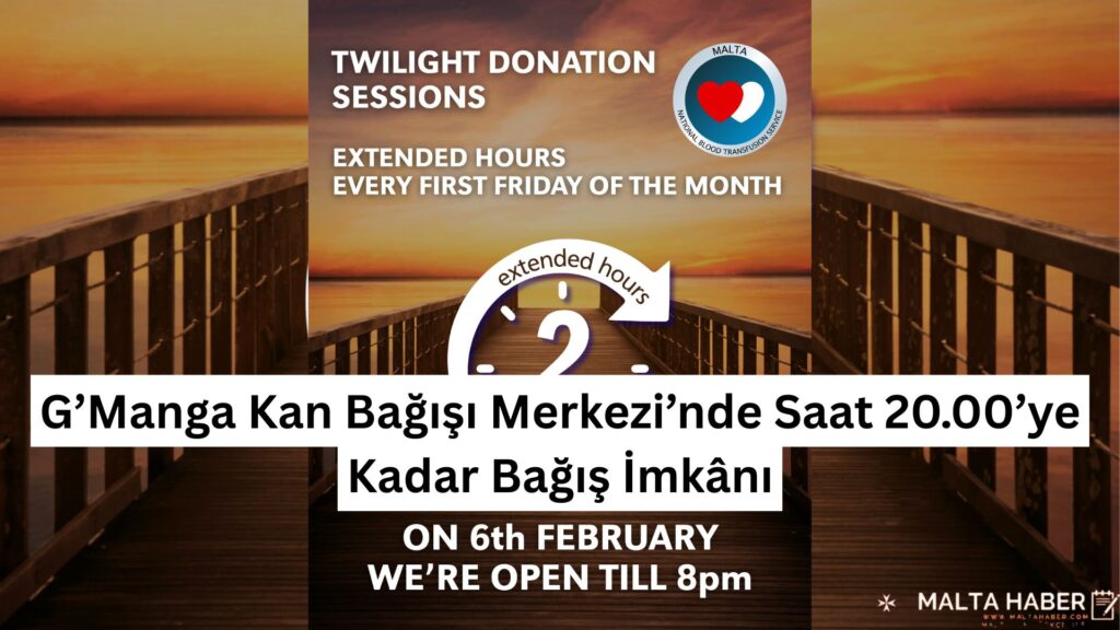 Malta’da kan bağışını teşvik etmek amacıyla G’Manga Kan Bağışı Merkezi’nde bu ay özel bir kan bağışı günü düzenleniyor. 6 Şubat Cuma günü gerçekleştirilecek bağış oturumunda, merkez akşam saat 20.00’ye kadar açık olacak. Kampanya özellikle mesai saatleri içinde çalışanlar ile öğrencilerin de rahatlıkla katılım sağlayabilmesini hedefliyor.