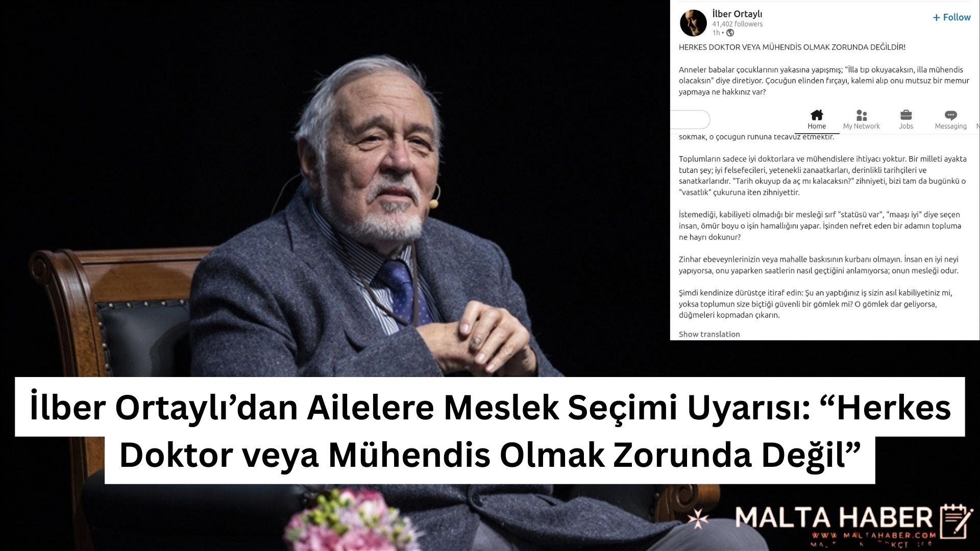Tarihçi ve akademisyen İlber Ortaylı, sosyal medya hesabından yaptığı dikkat çekici paylaşımda, çocukların meslek seçimleri konusunda ailelere önemli uyarılarda bulundu. Ortaylı, ebeveynlerin çocuklarını belirli mesleklere yönlendirme konusunda baskı kurmasının, onların mutluluğu ve topluma katkısı açısından olumsuz sonuçlar doğurabileceğini ifade etti.