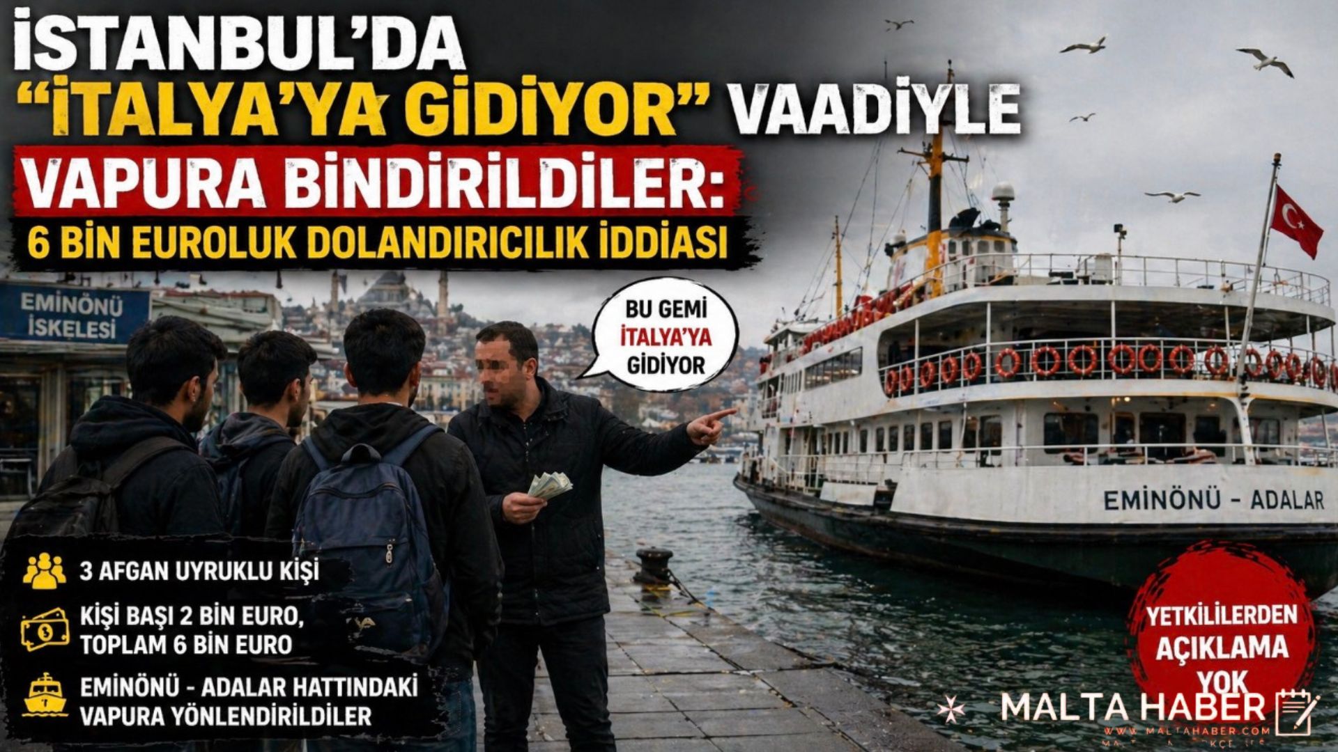 İstanbul’da üç Afgan uyruklu kişinin, Avrupa’ya götürülme vaadiyle kandırılarak şehir içi vapura bindirildiği iddiası sosyal medyada gündem oldu. İddiaya göre bir şahıs, kişi başı yaklaşık 2 bin euro olmak üzere toplam 6 bin euro alarak mağdurları “Bu gemi İtalya’ya gidiyor” diyerek Eminönü–Adalar hattında çalışan vapura yönlendirdi.