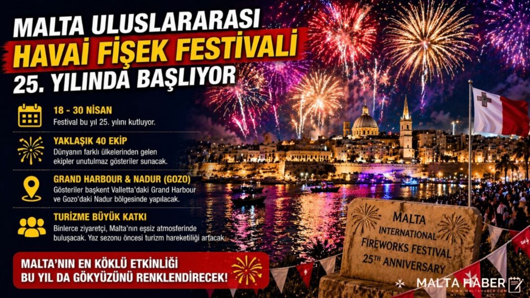 Malta’nın en köklü etkinliklerinden biri olan Malta Uluslararası Havai Fişek Festivali, bu yıl 25. yılını kutluyor. 18–30 Nisan tarihleri arasında düzenlenecek festival, başta Grand Harbour olmak üzere Gozo’daki Nadur bölgesinde gerçekleştirilecek ve yaklaşık 40 havai fişek ekibini bir araya getirecek.