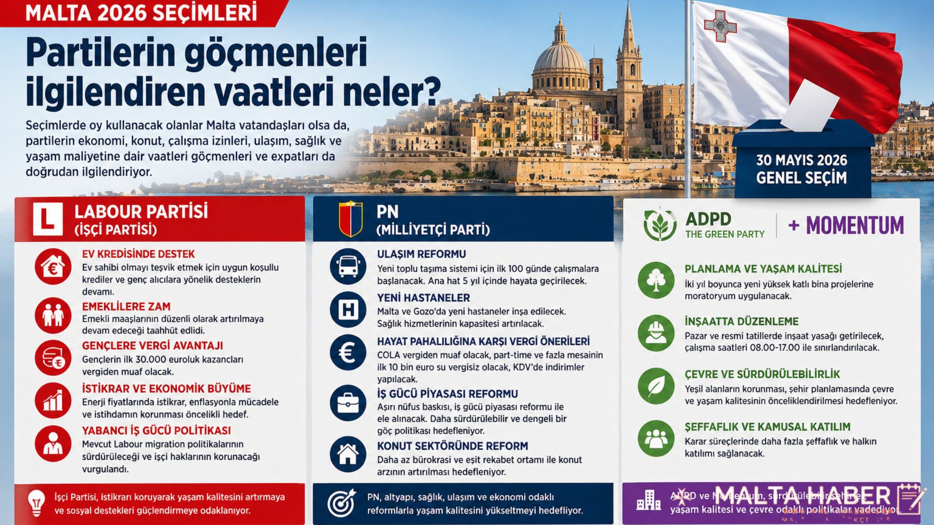 Şu aşamada partilerin tüm seçim manifestoları yayımlanmış değil. Bu nedenle göçmenler açısından tablo hâlâ tamamlanmış sayılmaz. Ancak ilk mesajlar, seçim kampanyasının yalnızca klasik sağ-sol rekabeti üzerinden değil; Malta’nın ne kadar büyüyeceği, bu büyümenin hangi sektörlerde yabancı iş gücüne dayanacağı, ulaşım ve sağlık kapasitesinin buna yetip yetmeyeceği ve konut baskısının nasıl yönetileceği üzerinden şekilleneceğini gösteriyor.