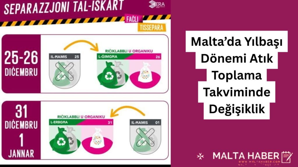 Malta Çevre ve Kaynaklar Otoritesi (ERA), Noel ve yılbaşı tatilleri nedeniyle evsel atık toplama takviminde geçici değişiklikler yapıldığını duyurdu.