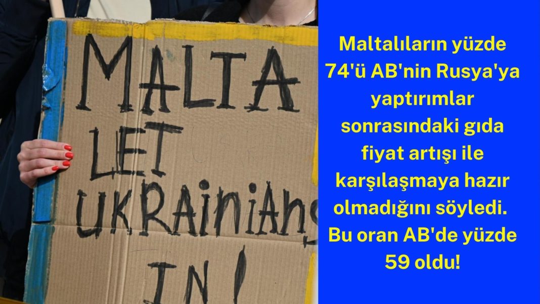 Maltalıların yüzde 74’ü Avrupa Birliği’nin Rusya’nın Ukrayna’yı işgaline karşı aldığı yaptırım kararlarının ardından gıda fiyatlarındaki artışla karşılaşmaya hazır olmadığını söyledi. AB’de bu oran yüzde 59 oldu.
