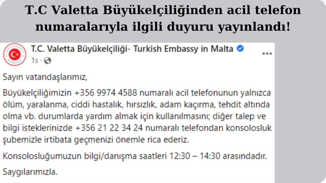 T.C Valetta Büyükelçiliği bugün yayınladığı duyuruda büyükelçiliğin +356 9974 4588 numaralı acil telefonunun sadece ölüm, yaralanma, ciddi hastalık, adam kaçırma, tehdit altında olmak gibi durumlarda aranması gerektiğini bildirdi.